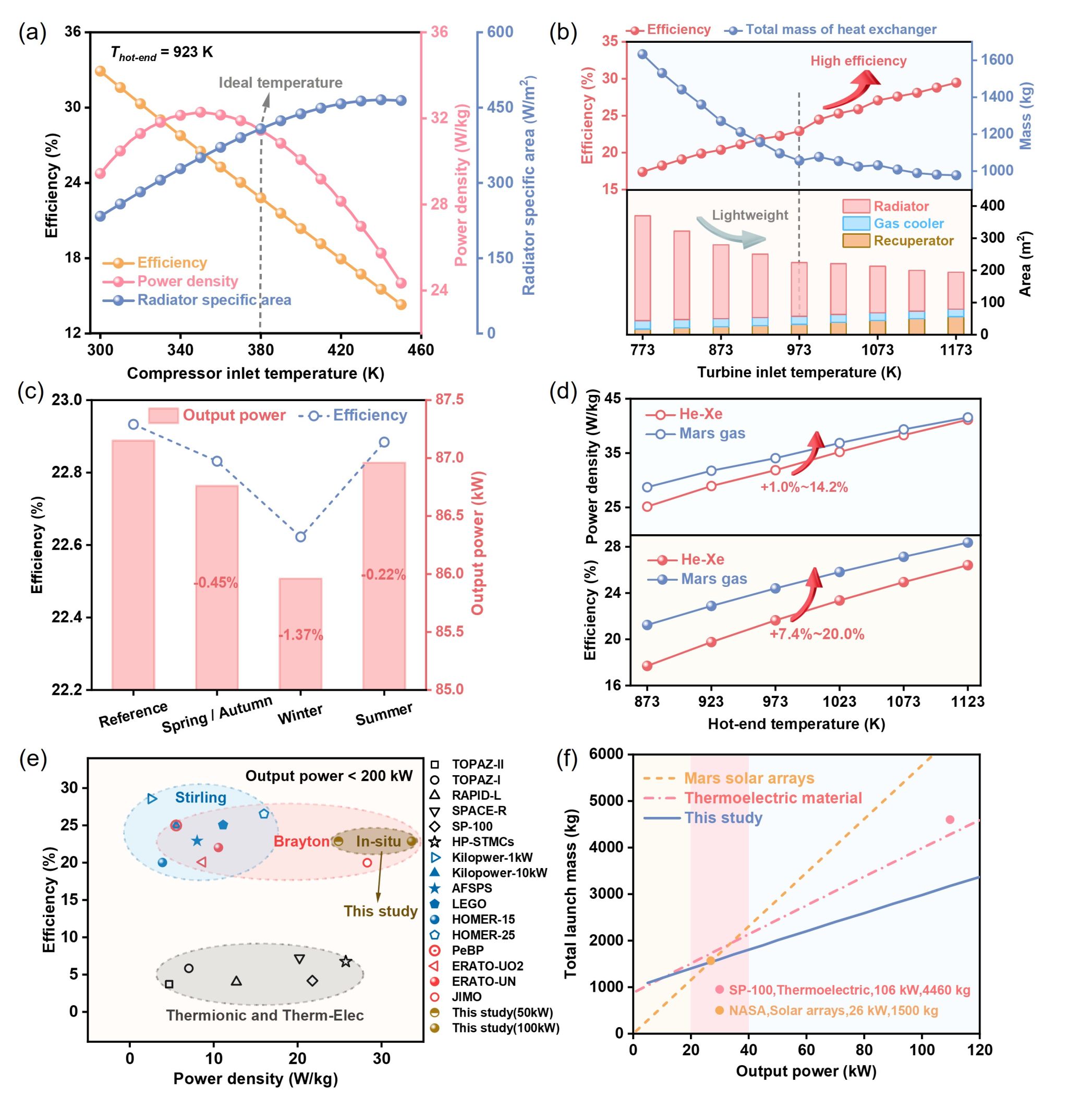 图2. (a) 冷端设计温度对系统效率、功率密度和辐射器比面积的影响;(b)热端温度对效率和部件重量的影响;(c)火星气体成分季节性迁移对系统性能的影响;(d)火星原位气体与氦氙稀有气体热电转化性能对比;(e)全球代表性空间热电转换项目的功率密度和效率分布情况;(f)原位气体热电转换在不同功率量级下的技术经济性评估。