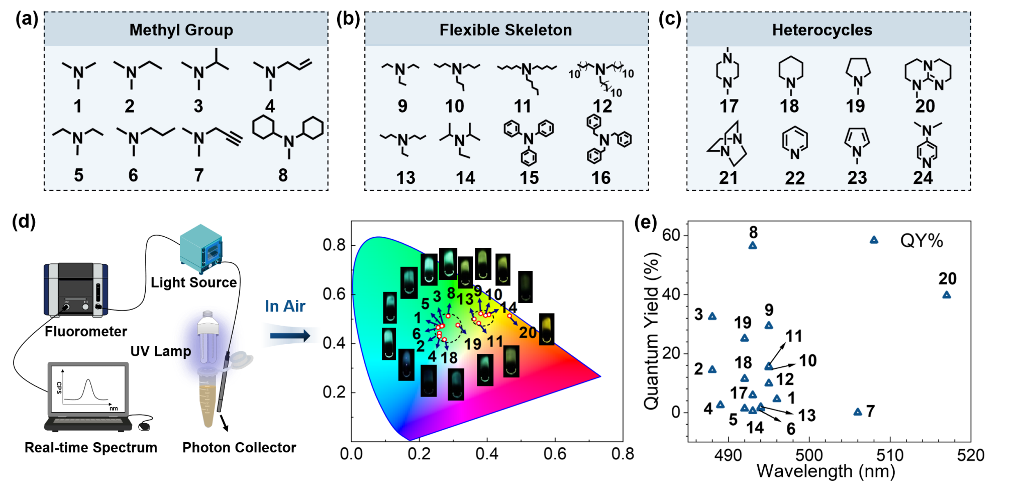 有机胺的识别和区分在药物分析、食品腐败、生物医学检测和临床诊断等领域的应用至关重要。现有的基于发光的胺识别方法主要依赖于荧光淬灭,这限制了灵敏性和选择性检测的范围(图1a, b)。最近,张国庆教授团队提出了一种荧光变色方法,用于快速区分不同的有机胺。在光照条件下,三级胺分子和被光激活的萘酰亚胺分子首先形成激基复合物(exciplex),并构象调整为稳定的光致电荷转移络合物(PCTC)。三级胺和萘酰亚胺分子在光照下的独特结合方式为高度类似的三级胺分子取代基结构的区分提供了条件(图1c)。