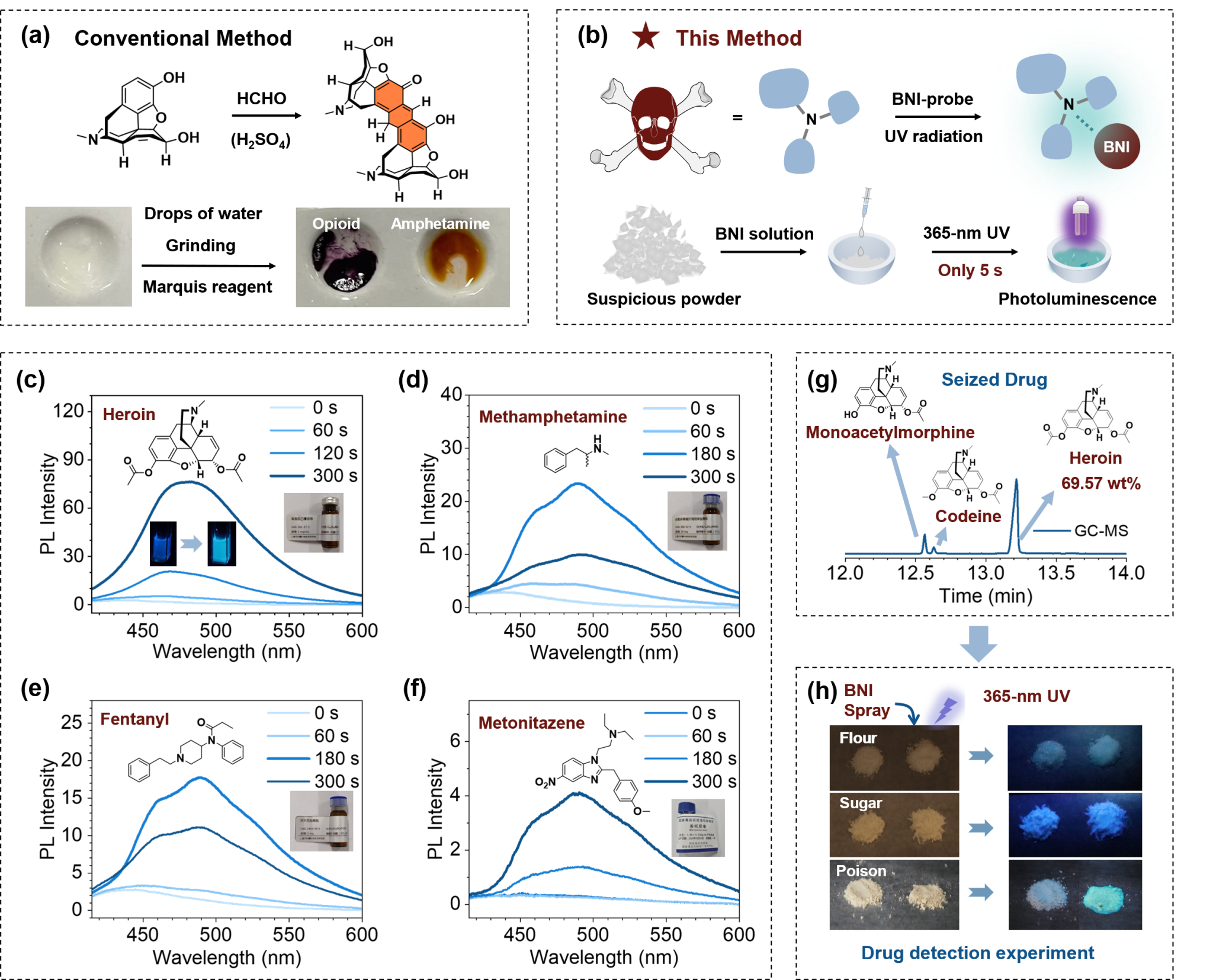 基于对三级胺的响应性,实验开发了一种用于视觉识别天然和合成阿片类药物(包括海洛因、芬太尼、甲基苯丙胺和美托尼秦)的定性方法,与Marquis试剂盒等现有方法相比,该方法更加简便快捷,并且可以促进现场测试、实时监控并简化实验室和现场环境中的工作流程(图4)。