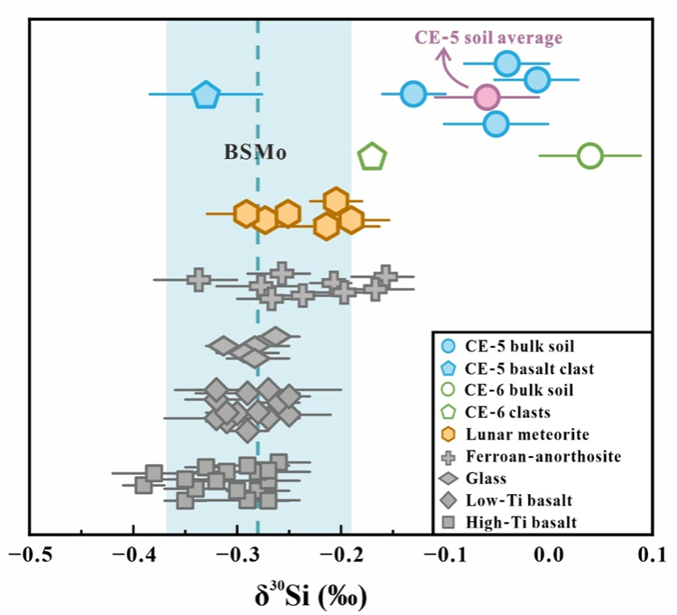 太空风化是月球表面物质长期在宇宙射线、太阳风、微陨石撞击等因素作用下发生的一系列物理、化学变化过程,对月球表面物质的成分和结构具有显著影响(图1)。为深入评估月球正反面的太空风化的效应,研究团队利用中科大金属稳定同位素实验室先进的同位素分析技术,对嫦娥五号和六号返回的月壤样品进行高精度硅同位素分析,测定了来自月球正面和背面样本的硅同位素组成。这一研究为理解月球正反面太空风化过程的差异提供了新的非传统稳定同位素证据,有助于完善月球表面物质演化模型。