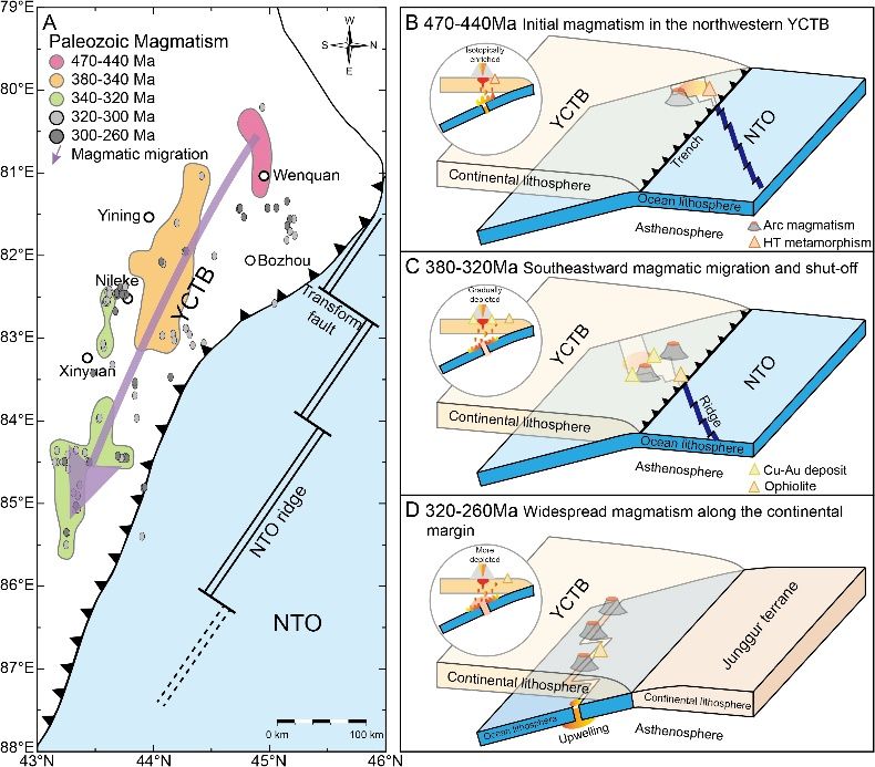 中国科学技术大学地球和空间科学学院、岩石圈演化和环境演变全国重点实验室郑永飞院士研究团队戴立群教授研究组以中国西北天山为研究靶区,系统梳理了该区域的古生代火成岩、蛇绿岩和碎屑锆石的空间分布、年代学与地球化学数据。结果显示,古生代岩浆活动存在明显的时空演化规律,岩浆岩与碎屑锆石随时间演化均显示逐渐亏损Nd-Hf同位素特征(图1),并伴随有同时期富Nb玄武岩-高镁安山岩-埃达克岩组合以及Cu-Au矿床的形成,指示了洋脊-转换断层交错俯冲导致的板片窗间歇性打开对弧岩浆的控制作用。相关研究成果以“Magmatic record reveals an ancient slab window linked to paleo-oceanic subduction”为题,5月23日发表在Nature Index收录的国际地质学知名期刊《Geology》上。