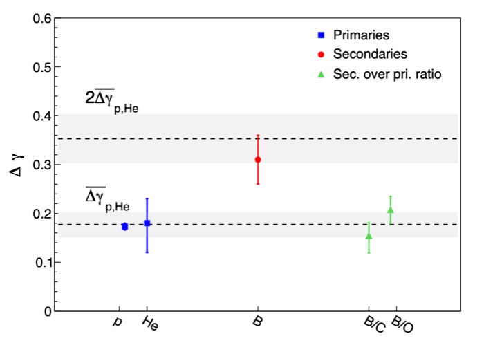 图2.DAMPE观测的硼核谱指数变硬程度∆γ与质子、氦核、硼碳比例、硼氧比例结果的对比。硼核的∆γ约为其他结果的两倍。