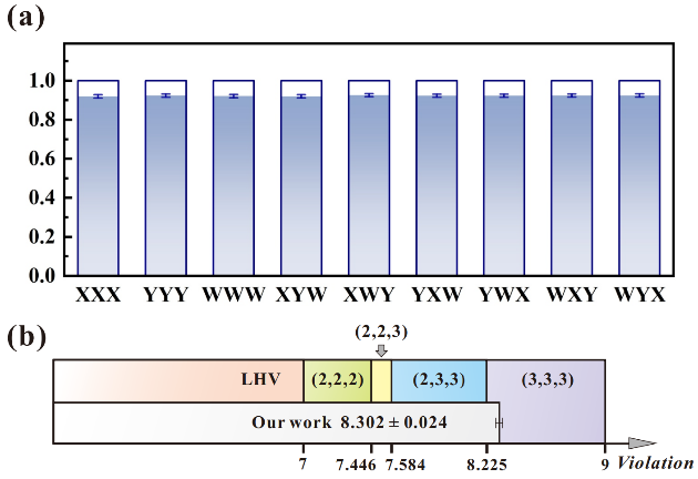 在此基础上,研究团队通过构建新型贝尔不等式检验范式,实验观测到超越量子比特系统理论极限的量子关联。该成果首次在实验层面证实了真实高维多体非局域性的存在,为设备无关型量子信息应用的未来发展奠定了重要基础。这项突破性成果不仅填补了国际高维多体量子非局域性实验研究领域的空白,更深化了人类对量子纠缠本质的认知,同时为构建可扩展、高容量、抗噪声的量子信息处理系统提供了关键技术支撑。作为新型量子资源,高维多体纠缠态在量子通信、量子计算与量子精密测量等前沿领域展现出广阔应用前景。