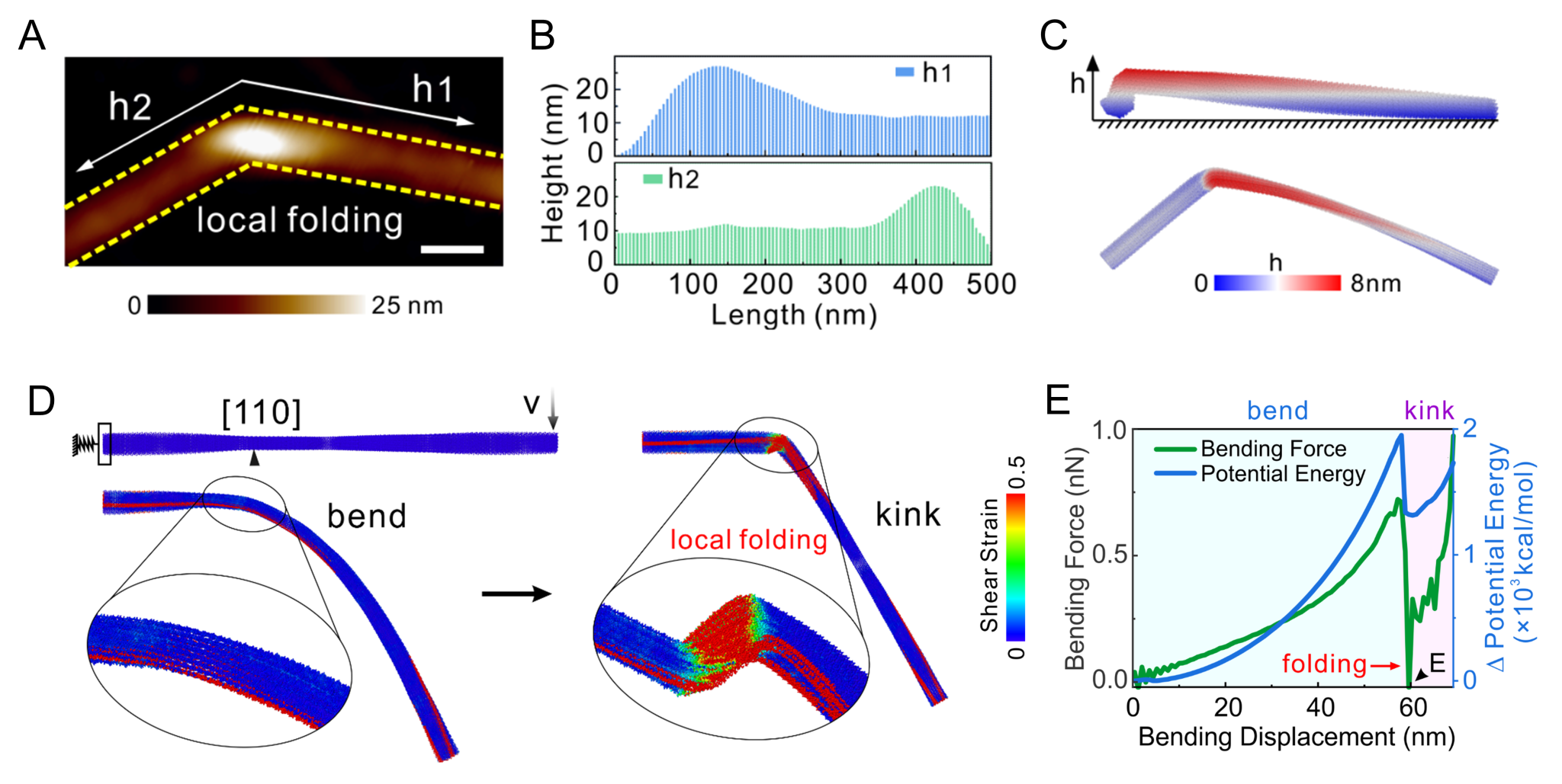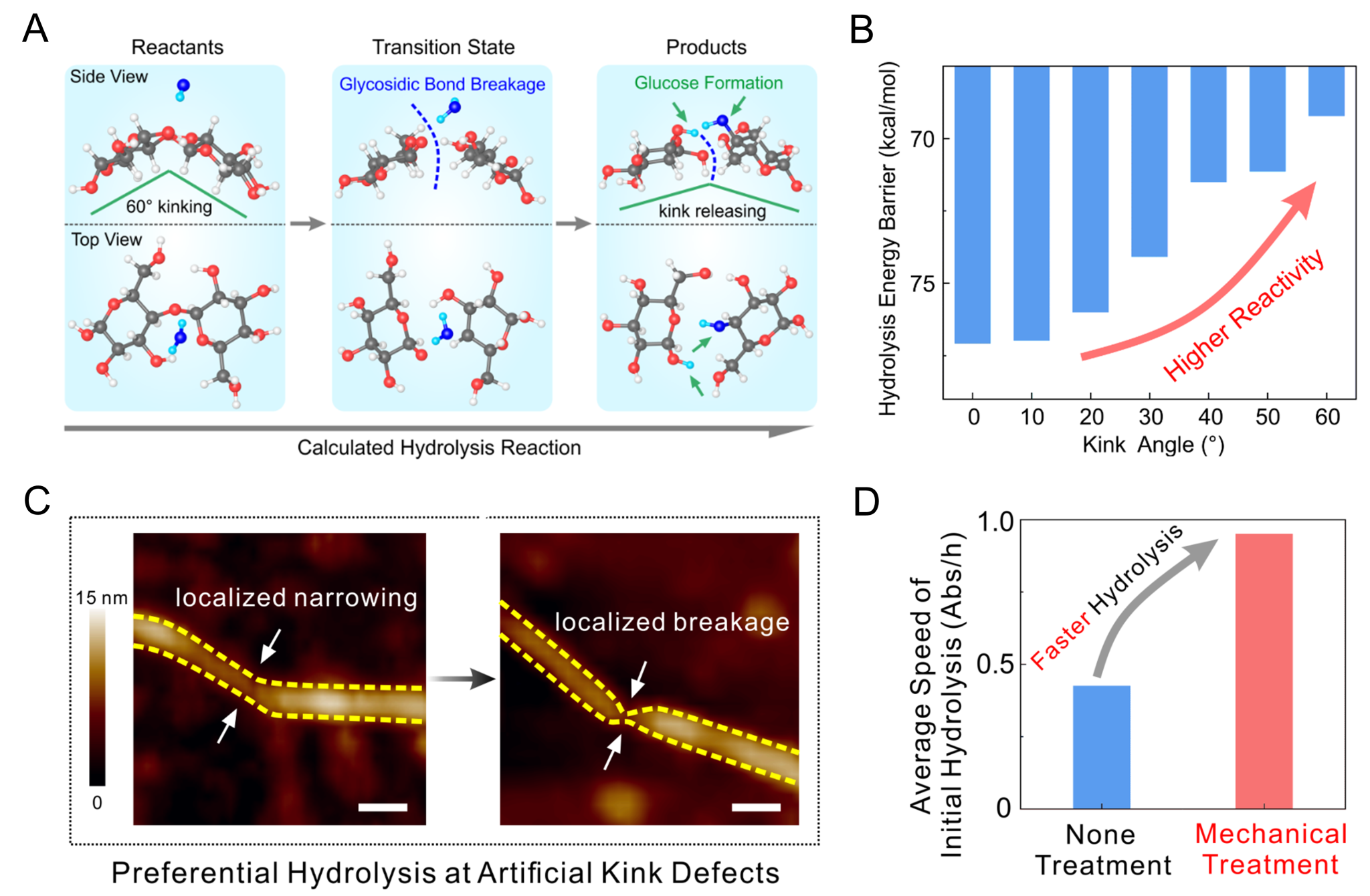 研究团队首先通过原子力显微镜的定量表征,发现了经过机械处理后纳米纤维素在广泛存在的弯折缺陷处呈现典型的三维形貌突变,并基于大规模分子动力学模拟阐明了弯折缺陷的微观力学机理,外载作用下纳米纤维素为耗散积累的能量和应力发生局部的三维塑性变形并伴随微结构畸变和氢键断裂;进一步,结合第一性原理计算和原位水解实验揭示了弯折缺陷的力化学机理,弯折缺陷处分子链的非线性几何构型驱动水解反应向具有较低自由能垒的理想反应路径发展以促进在弯折缺陷处的优先水解。
