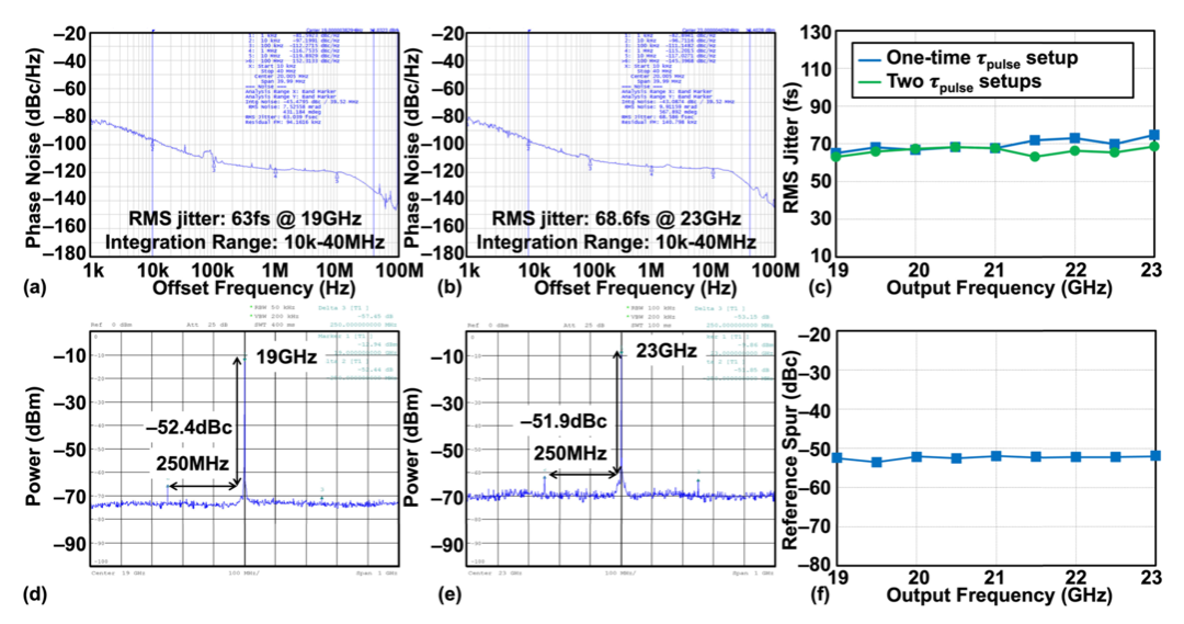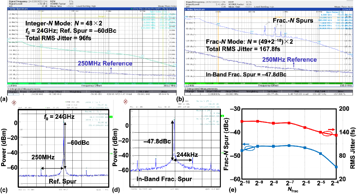 另一方面,传统基于数字时间转换器(DTC)的小数型锁相环,其抖动与小数杂散性能通常受限于DTC本身的相位噪声和非线性。为突破这一瓶颈,论文《A Charge-Domain Fractional-N ADPLL Based on Charge-Steering Sampling》提出了一种全新的电荷域小数型全数字锁相环架构(见图3)。该架构融合了三项关键技术:基于电荷舵采样(CSS)的高线性度相位检测、中升编码实现的高鉴相增益以及在电荷域内基于电容DAC的ΔΣ量化误差补偿机制,从而实现优异的小数分频性能。芯片测试频率范围为21–25 GHz,结果如图4所示:在整数模式下,积分抖动为96飞秒(fs),参考杂散达到–60 dBc;在小数模式下,积分抖动为168 fs,带内最差小数杂散为–48 dBc。