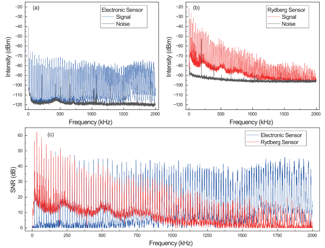 图2:频域对比图。(a)使用金属天线测量得到的电弧射频信号。(b)使用里德堡原子天线测量得到的电弧射频信号。(c)两种测量方法的频域信噪比对比。