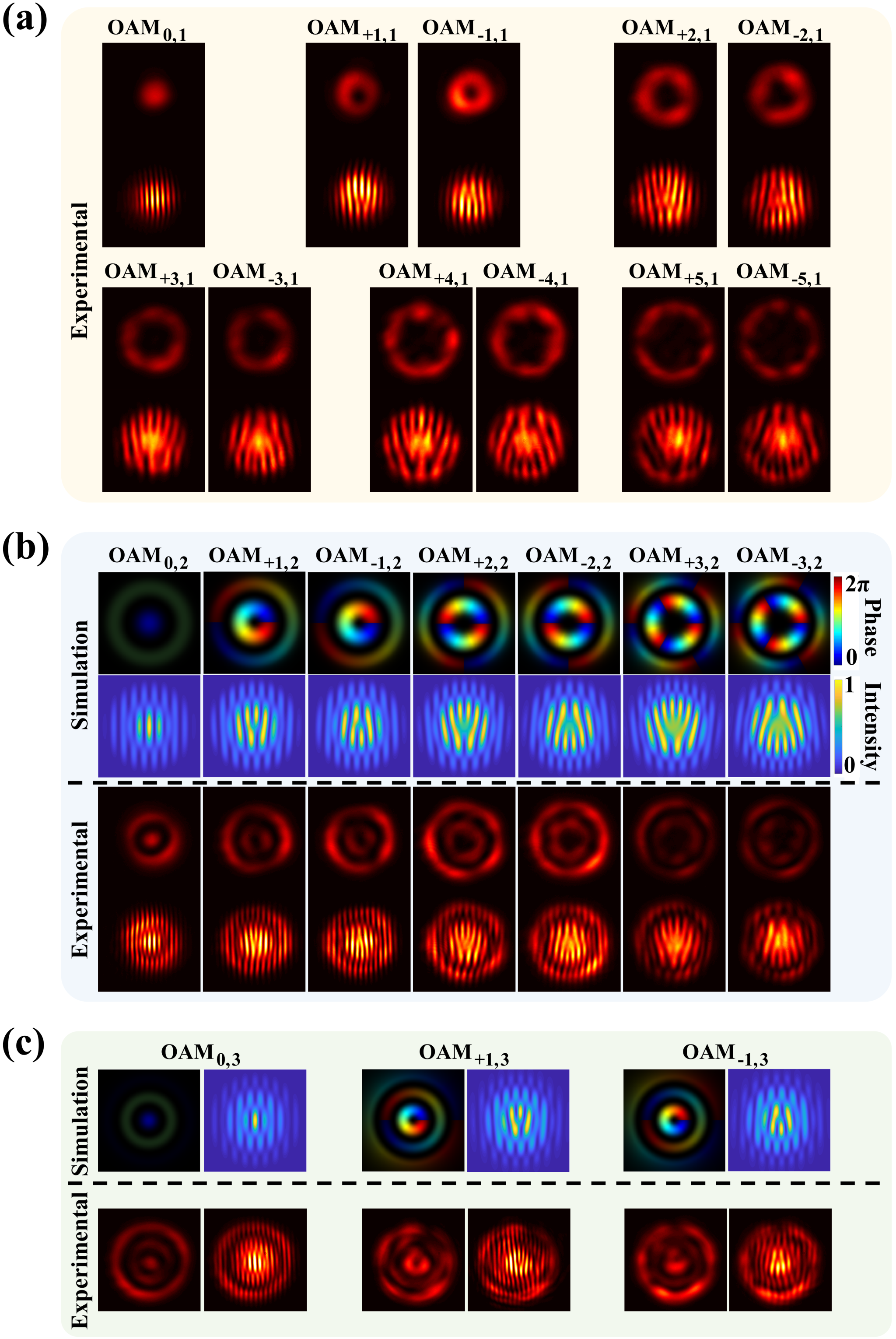 图2:(a)径向指数为1的OAM模式的光强分布及检测结果;(b)径向指数为2的OAM模式的光强分布及检测结果;(c)径向指数为3的OAM模式的光强分布及检测结果。