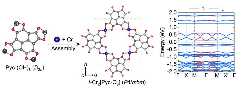 图2. 吡喃烯基金属有机框架单层材料t-Cr₂[Pyc-O₈]与电子能带结构