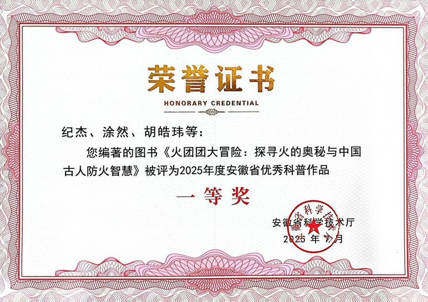 由我校火灾安全全国重点实验室纪杰研究员团队创作的消防科普漫画图书《火团团大冒险:探寻火的奥秘与中国古人防火智慧》荣获2025年安徽省优秀科普作品(图书)一等奖(唯一一项)。自出版以来,广受读者好评,屡登京东、当当等网络平台热销榜单,上市一年已印刷9次,总印量3.0万册。此书还入选2025年中央电视台《全民阅读盛典》推荐的百本“全民阅读书单”,并荣获2024年中国消防协会消防科普作品评选特别优秀奖(唯一一项)和安徽省科协“典赞•2024 科普安徽”年度科普图书等荣誉。该作品自出版以来,创作团队积极履行社会责任、传播科学知识,为提升民众消防安全素养做出了积极贡献,开展公益科普讲座、图书捐赠、阅读分享会及互动实验活动等70余场,向多个学校、社区及消防、文物部门捐赠图书近4000套。