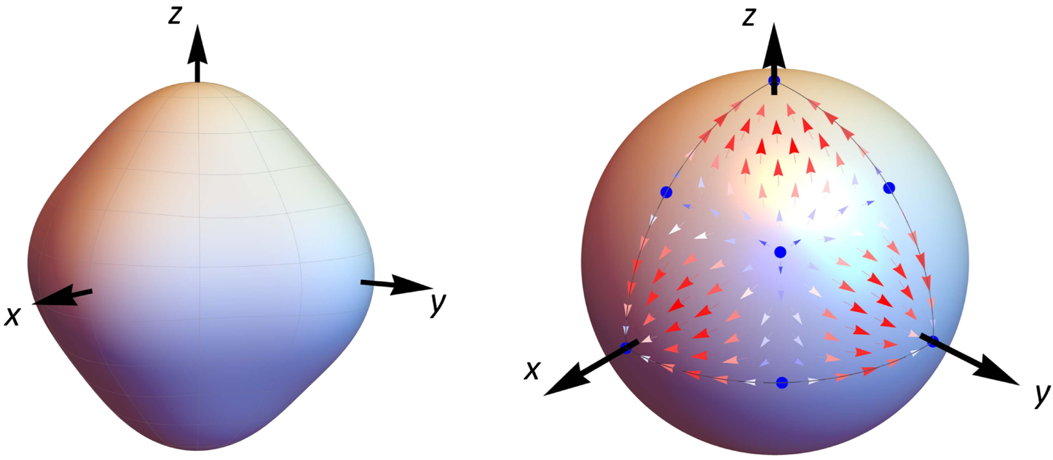 图2:正八面体群中由八极矩导致的平面反常霍尔效应。传统反常霍尔电导(左图)和平面反常霍尔电导(右图)在磁化空间中的分布。