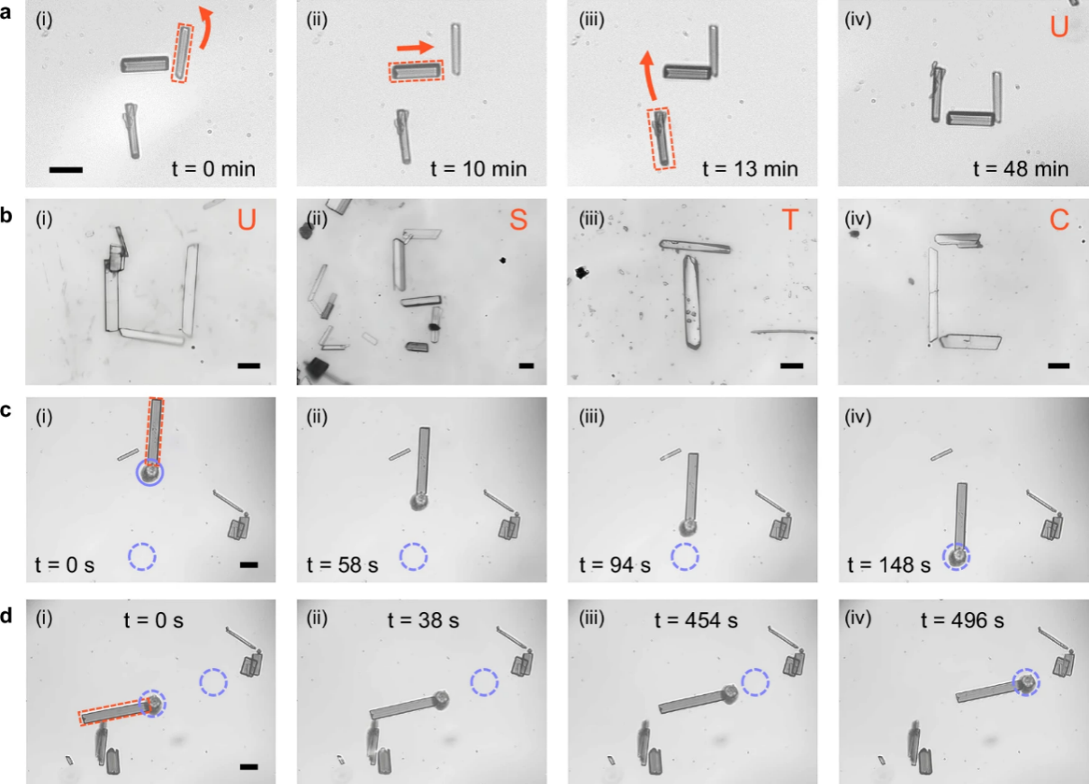 研究团队创新性地利用靛蓝类给受体分子制备出有机微晶光致动器,在405nm激光驱动下,可在硅、氮化硅、蓝宝石、铌酸锂等多种光子芯片基底上实现精确运动(图1)。通过自行搭建扫描振镜控制系统,团队实现了对光致动器运动轨迹的完全编程控制,单步运动精度达30nm,并具备前进、后退、左右转向等多自由度运动能力,还能推动直径22μm的二氧化硅微球精确定位,展现出强大的片上微纳操纵性能(图2)。