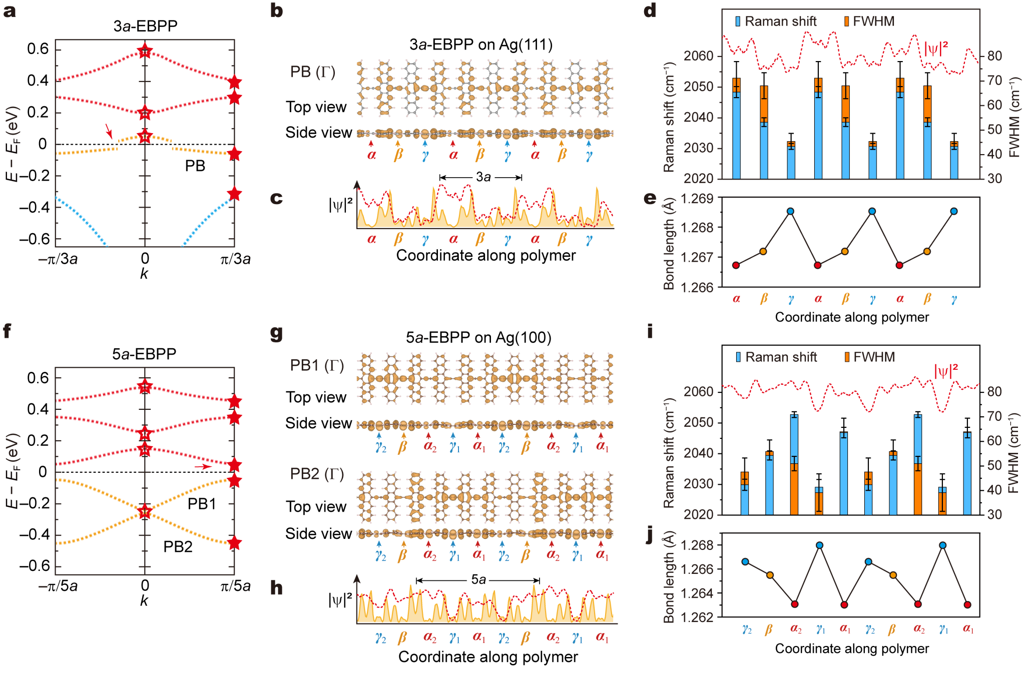 图2 a,f:基于实验结果刻画出的极化子能带结构。b,c,g,h:理论计算与实验测量的极化子态密度。d,i:桥连乙炔键的拉曼频率与峰宽调制的实验结果。e,j:桥连乙炔键键长的计算结果。