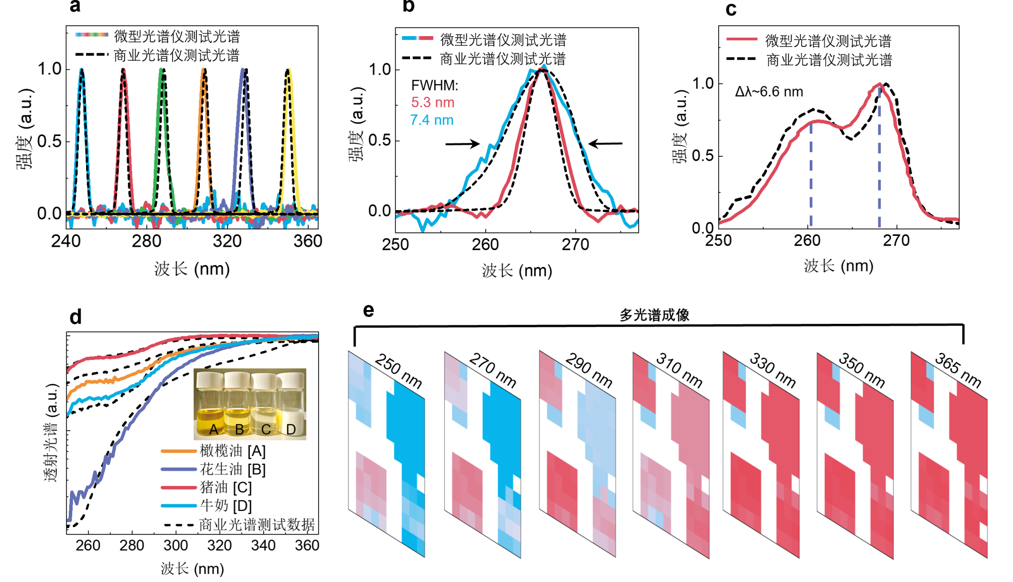 基于这一微型光谱仪芯片,研究团队成功对不同有机物质(如橄榄油(A)、花生油(B)、动物油脂(C)和牛奶(D))液滴进行了空间分辨与单次直接成像。每个像素捕获依赖于波长的光电流信号,并形成一个完整的三维数据集,通过利用神经网络算法进行光谱重构,生成高分辨率的光谱图像,清晰展示了不同有机物在紫外波段的独特紫外吸收特性(图2d)及其空间分布(图2e)。该结果展示了微型化紫外光谱及成像芯片在有机检测方面的巨大应用潜力。