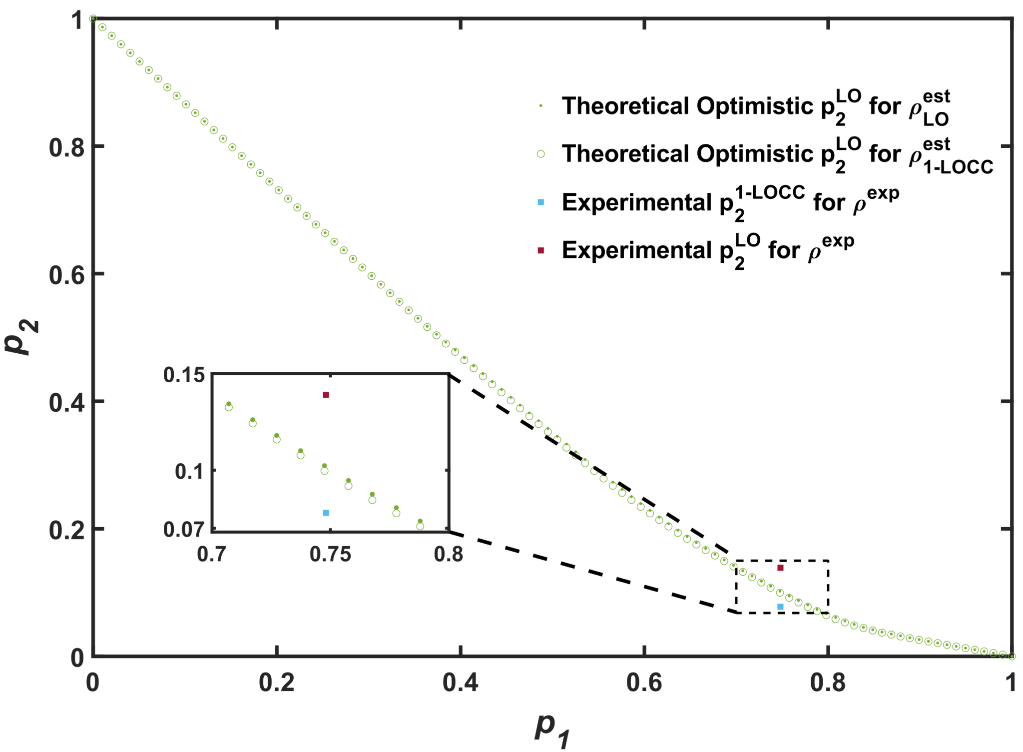 图2.LO协议与1-LOCC 协议下假阴性概率p2的对比(红色方块和蓝色方块)。结果显示,在1-LOCC 场景中,实验测得的p2值显著低于基于LO 协议的乐观估计(绿色圆形),表明引入经典通信能够有效降低检测错误率。