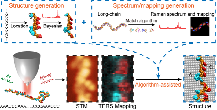 近日,中国科学技术大学单分子科学团队的董振超研究小组在单链DNA分子结构表征领域取得重要进展,将匹配算法与贝叶斯优化结合到针尖增强拉曼光谱(TERS)分析中,实现对长链单个DNA分子的无标记结构识别与成像(图1),为高分辨无标记DNA结构表征提供了新的思路和途径。该成果于9月25日在学术期刊《JACS Au》上在线发表。