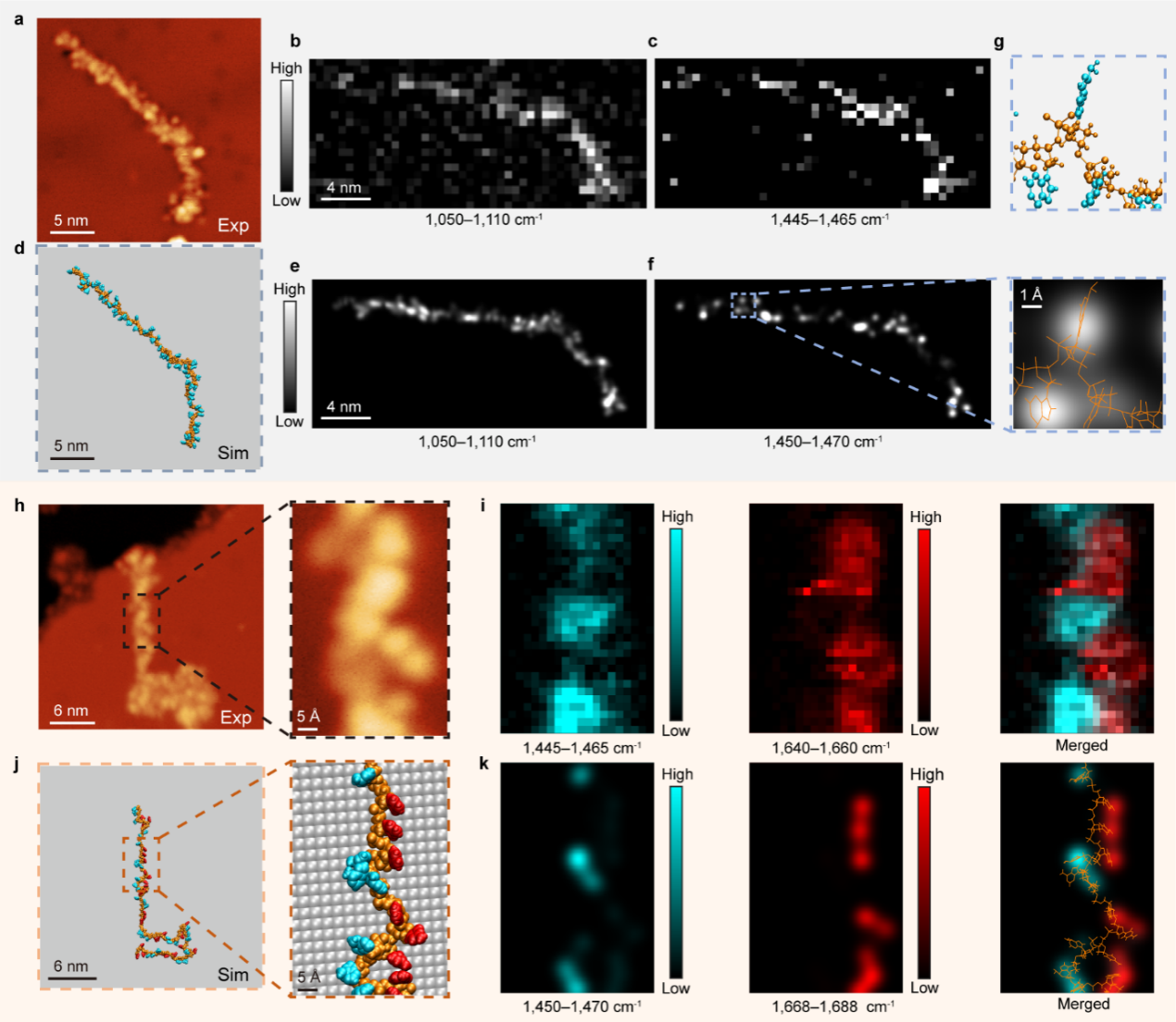 团队在采用短链DNA分子验证该算法的精确性和有效性的基础之上,以60个碱基组成的A60和(AAACCC)10这两种序列的长链DNA分子作为模型体系,对算法模型进行了进一步的实验验证。首先,在超高真空(约10-10Torr)和液氦温度(约7K)的实验条件下成功测量了两种序列分子不同位点对应的TERS光谱和高分辨成像,接着利用上述算法成功解析了对应分子的化学结构,能够在0.6nm的空间分辨率下分辨不同碱基并识别其空间取向和构型差异。通过与算法解析得到的结构对应的理论模拟TERS成像进行对比,发现二者在整体特征上有很好的对应性,特别是对于…AAACCC…序列,可以很好地区分碱基A和碱基C的不同空间分布特征(图3)。