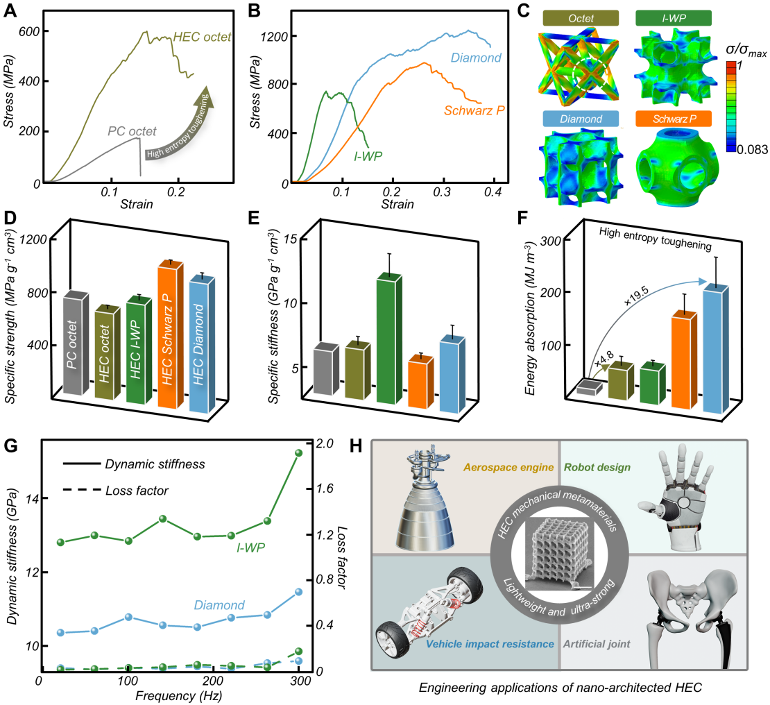 测试结果显示,该高熵陶瓷纳米晶格展现出超越1GPag⁻¹cm³的超高比强度、高达230MJm⁻³的能量吸收能力以及卓越的断裂韧性(图2)。该研究为探索多组分结构陶瓷微纳器件的制造,尤其是高熵陶瓷在微纳机电系统与航空航天等领域的应用提供了全新解决方案。