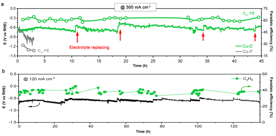 图2. 多层级高曲率铜电极长时间大电流CO2电解下的稳定性能。
