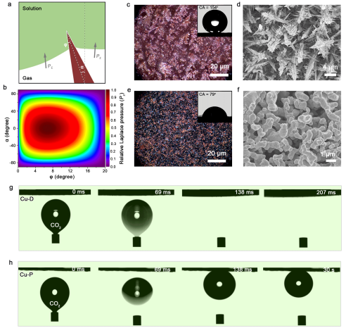 模拟发现,当高曲率铜的针尖半角为7°,倾斜角为0°时,其拉普拉斯压最大,疏水性最强(图1a, b)。基于此,该研究组采用电沉积方法,通过调控沉积时间获得针尖结构的铜电极。接触角测试证实该高曲率铜电极表面接触角为154o,属于超疏水范畴。相比之下,低曲率的铜颗粒电极表面接触角仅为154o,呈现亲水特性(图1c-f)。CO2气体的黏附实验进一步说明了研制的分层级高曲率铜电极在水下能快速地捕获、吸附和传输CO2气泡,表现出良好的嗜气性(图1g, h)。