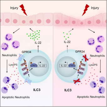 2021年6月8日,中国科学技术大学周荣斌/江维教授团队在Immunity发表题为“GPR34-mediated sensing of lysophosphatidylserine released by apoptotic neutrophils activates type 3 innate lymphoid cells to mediate tissue repair”的研究论文,率先证明ILC3s可直接识别组织损伤并发现GPR34在其中发挥关键作用。
