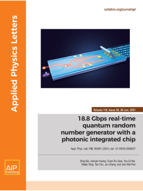 近日,中国科大教授潘建伟、张军等联合浙江大学储涛教授研究组,通过研制硅基光子集成芯片和优化实时后处理,实现了速率达18.8 Gbps迄今最快的实时量子随机数发生器,相关研究成果以“封面论文”的形式发表于《应用物理快报》[Appl. Phys. Lett. 118, 264001 (2021)]。美国物理联合会(AIP)以“量子随机数发生器实现尺寸和性能新基准(Quantum Random Number Generator Sets Benchmark for Size, Performance)”为题刊发新闻稿对该工作进行了报道,SciTechDaily、phys.org、Scienceblog、MIT Technology Review等多家科技媒体也进行了相关转载报道。