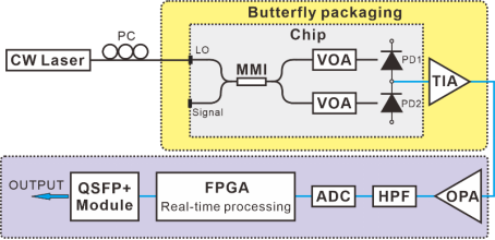 对于实用化量子随机数发生器,实时生成速率和集成度是核心指标。然而,上述量子随机数产生方案难以实现高度集成。为此,潘建伟、张军等进一步发展了基于真空态涨落的高速量子随机数产生方案并完成相关实验验证,同时与浙江大学储涛等合作,针对该方案通过多次迭代制备了相应的硅光芯片,并采用混合集成技术将硅光芯片、InGaAs平衡探测器以及跨阻放大器(TIA)封装在尺寸为15.6mm×18mm的芯片内。与此同时,通过进一步优化FPGA实时后处理算法和硬件实现,从而在实现高集成度的同时大大提升了量子随机数发生器的实时生成速率。经传输测试,该量子随机数发生器系统的最终实时速率达到创世界纪录的18.8Gbps。上述研究成果为开发低成本商用量子随机数发生器单芯片奠定了坚实的技术基础。