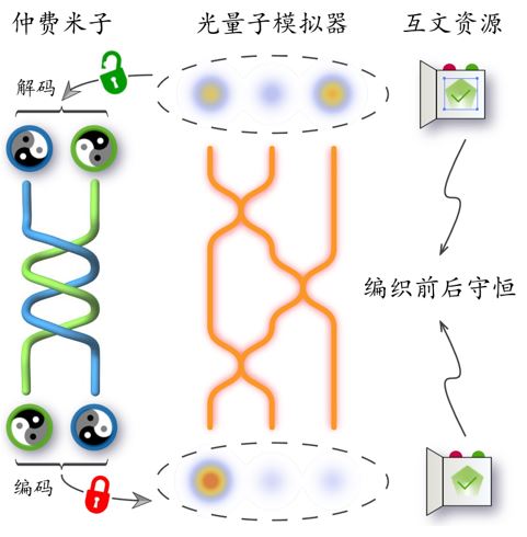 李传锋、韩永建、许金时等人在前期关于马约拉纳零模体系的工作基础上[Nat. Commun. 7, 13194 (2016); Sci. Adv. 4, eaat6533 (2018)],研究了新型非阿贝尔任意子的性质。研究组使用光量子模拟器研究了仲费米子零模的特性。仲费米子零模是马约拉纳零模的推广,它具有三重简并的基态并且天然地免疫准粒子中毒等退相干因素。借助一种非定域的数学变换,研究组将一条包含两个仲费米子零模的仲费米子链编码成一个多模式马赫-曾德尔干涉仪中光子的波函数。利用不同模式间光子的干涉以及相应激发模式的耗散,研究组在光量子模拟器中展现了仲费米子零模的编织统计和拓扑抗噪性质。编织操作的过程保真度达到93.4%。