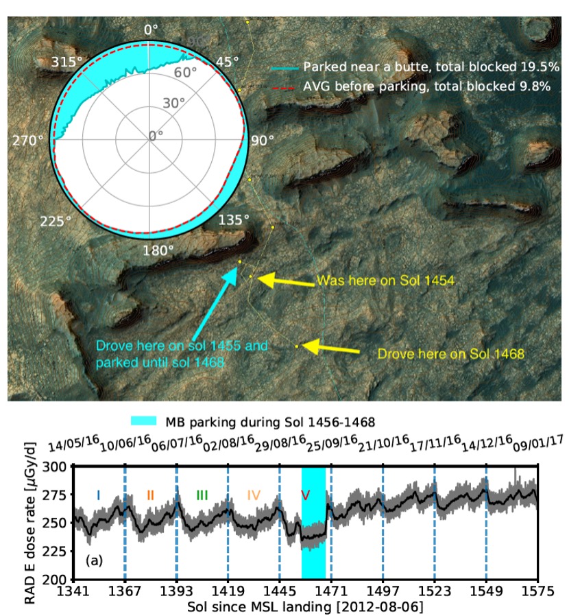 2016年9月,好奇号路过了一个多岩石区域(Murray Buttes),并且在非常靠近一个岩石的位置停留了13天左右进行采样和作业,如图所示。在逼近岩壁的当天,RAD观测到了辐射剂量的突然下降;在重新离开岩石的过程中,RAD探测到了辐射剂量的逐渐回升。同时,研究人员绘制了火星车360度全景能见度图,发现在停车的位置,大约有近20%的天空视野被岩石完全遮挡。而停车之前,RAD的天空能见度约为90%以上。也就是说,临近的岩石屏蔽了一部分来自高空的粒子,导致了辐射的减少。这一减少的幅度虽小,但是首次直接证实了火星的表面结构(土壤、岩石、岩洞、火山熔岩管道等)可能作为未来载人登火任务的“辐射避难所”。