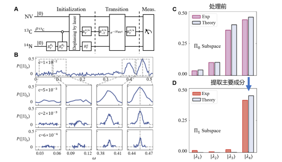 实验中研究人员使用金刚石氮-空位色心量子处理器,演示了对未知量子数据矩阵进行分析与处理的过程。待研究的数据以量子密度矩阵的形式被输入量子处理器,如图C所示,该数据矩阵包含4种不同成分且占比各不相同(对应数据柱高度)。特征提取任务的目标是将该数据的关键特征,即右侧第一组占比最高的成分提取出来,同时尽量去除其他三组数据或噪声。实验中,研究人员使用一个辅助比特作为探针进行扫描,精确定位了密度矩阵中不同成分的强度(图B中的不同谱峰)。通过多次迭代逼近,密度矩阵成分的定位误差被降低到小于0.001,相当于原本10个辅助量子比特才能达到的精度。其后,研究人员锁定该数据矩阵的主要成分并将其隔离提取出来(图D),得到的量子态即为输入数据矩阵的关键特征。实验结果显示,这一特征提取过程达到了90%的提取精度与86%的提取效率,展示了该新技术在真实物理平台上的适用性与精确性。
