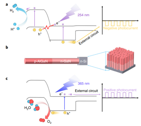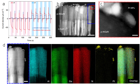 基于前期的工作积累,研究人员从GaN基半导体p-n异质结能带结构设计,MBE外延工艺探索及纳米线形貌调控出发,结合DFT第一性原理理论计算优化及半导体表面金属铂(Pt)纳米颗粒定向修饰,成功构建了基于p-AlGaN/n-GaN异质p-n结的光谱可分辨型光电探测器[Nature Electronics 2021, 4, 645–652]。图1为器件的工作原理示意图。在固定偏压下,该器件在两种不同波长光的照射下展现出独特的光电流极性反转现象:在254nm光照下光电流为负电流,而在365nm光照下光电流为正电流。具体来说,为实现光电流极性反转,特殊设计的顶部p-AlGaN被用于与底部n-GaN共同吸收波长254 nm的光(图1b)。在254nm光照射下,p-AlGaN和n-GaN中同时产生电子-空穴对(图1a)。其中,p-AlGaN在电解质溶液中向下的表面能带弯曲有利于其中的光生电子向纳米线表面漂移,驱动质子还原反应,而光生空穴则向p-n结中的空间电荷区域迁移,与n-GaN产生的光生电子隧穿复合。与此同时,n-GaN中的光生空穴流经外电路,表现出负的光电流信号。而当纳米线暴露在365nm光下时,因p-AlGaN不吸收365nm光照,仅有n-GaN吸收365nm光照后产生光生电子-空穴对。而后,由n-GaN在电解质溶液中呈现的向上表面能带弯曲作为驱动力,促使n-GaN中的光生空穴漂移到纳米线/溶液界面并进行水氧化反应。同时,在表面能带弯曲和p-n结内建电场共同作用下,电子向外电路漂移,被记录为正的光电流。更进一步,理论计算证实:通过在半导体p-AlGaN表面修饰贵金属Pt纳米颗粒可以有效改善氢吸附自由能并提高光电化学光探测过程中的光生载流子分离效率。据此,研究人员利用光化学还原法,成功在纳米线p-AlGaN(000-1)晶面定向修饰Pt纳米颗粒(图2b-d)。最终,在固定偏压下,研究人员成功观察到在不同波长光照下GaN基pn结纳米线中的光电流极性反转现象(图2a)。