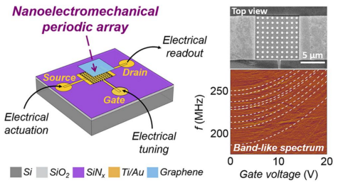 具有周期性阵列结构的纳米机电系统,其机械振动响应在频率上可以展现出带状结构,用以制备声子晶体。声子晶体因其在调控声子耗散及操纵声子传播等方面的巨大潜力,吸引了广泛的研究关注。通过设计合适的声子能带结构,可以大大提高嵌入其中的声学谐振器的品质因子,提升声子寿命。与此同时,声子晶体还可以用于制备声学波导,实现声子传递。对声子晶体的研究,渐渐成为了近年来的热点研究方向之一。然而,对声子能带结构的调控,往往通过设计制备不同几何参数的器件来实现,如何对能带结构进行外场调节,仍然充满挑战。