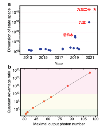 图3:论文数据图。a图表示输出态空间的维度。b图表示光量子计算原型机相比超算的优势倍数。