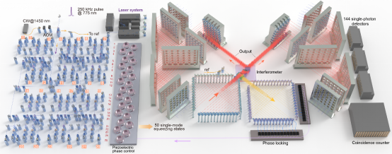 2021年,团队在“九章”的基础上,进行了一系列概念和技术创新。受到激光—“受激辐射光放大”概念的启发,研究人员设计并实现了受激双模量子压缩光源,显著提高了量子光源的产率、品质和收集效率。其次,通过三维集成和收集光路的紧凑设计,多光子量子干涉线路增加到了144维度。由此,“九章二号”探测到的光子数增加到了113个,输出态空间维度达到了1043。进一步,通过动态调节压缩光的相位,研究人员实现了对高斯玻色取样矩阵的重新配置,演示了“九章二号”可用于求解不同参数数学问题的编程能力。根据目前已正式发表的最优化经典算法,“九章二号”在高斯玻色取样这个问题上的处理速度比最快的超级计算机快亿亿亿倍。