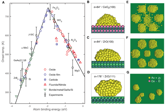 图3.抗烧结性Sabatier原理的实验和理论证明。(A)负载Au纳米催化剂的模拟烧结开启温度及其实验数据对比。(B-G)第一性原理神经网络势函数分子动力学模拟。
