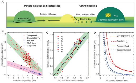图1.烧结机理和标度关系。(A)粒子迁移团聚与熟化示意图;(B)金属原子在载体上的扩散能垒与金属原子在载体上吸附能间的标度关系;(C)约化的金属原子吸附能和金属纳米粒子与载体的粘附能间的标度关系;(D)负载金属纳米粒子的化学势随尺寸的变化关系。