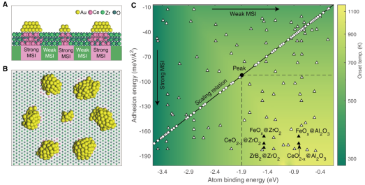 图4.超越火山型关系双功能载体的设计和高通量筛选。(A)强和弱界面相互作用组成的双功能载体。(B)CeO2-x@ZrO2(111)双功能载体稳定Au团簇。(C)高通量筛选6724种双功能载体。