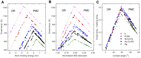图2.纳米催化剂稳定性的Sabatier作用原理。(A)纳米催化剂烧结开启温度对原子吸附能的火山型依赖关系。(B)开启温度对约化的界面相互作用描述符的火山型关系。(C)用金属体相材料熔点约化的开启温度与接触角间的普适火山关系图。