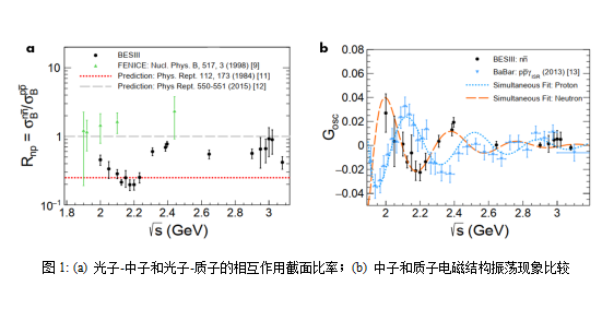 该研究团队通过能量扫描方法,利用北京谱仪BESIII实验在质心能量2.0-3.08 GeV的对撞数据,精确测量正负电子对湮没到中子-反中子对过程的产生截面及有效电磁形状因子。研究团队通过联合中子、反中子在各子探测器的信息,大大提高选择效率,总的统计量达到FENICE实验的60倍以上;通过修正中子、反中子的模拟信息以及中性过程的触发效率,降低实验的系统误差。从而获得目前最精确的中子电磁形状因子测量结果。实验结果清楚地表明光子与质子耦合更强[图1(a)],解决了长期存在的光子-核子耦合问题。此外,研究团队在中子的电磁形状因子分布上观测到了周期性振荡的结构,其振荡频率与质子相同,相位接近正交[图1(b)]。反常的正交振荡结构暗示着核子内部存在未理解的动力学机制,可能的解释包括末态散射效应以及共振结构干涉等。