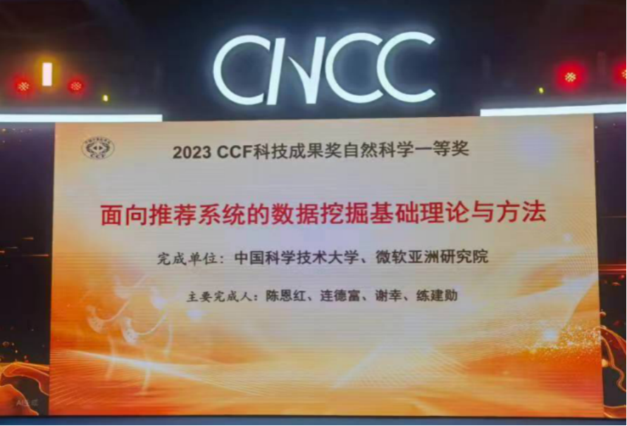 今年CCF科技成果奖的自然科学奖共评选出一等奖1项、二等奖5项。其中,我校计算机科学与技术学院陈恩红教授、连德富特任教授分别作为第一、第二完成人的《面向推荐系统的数据挖掘基础理论与方法》项目获得了唯一的一等奖。项目联合了微软亚洲研究院资深首席研究员、科大兼职博导谢幸博士以及资深研究员练建勋博士共同完成。CCF理事长梅宏院士、奖励委员会主席廖湘科院士为陈恩红教授颁奖。