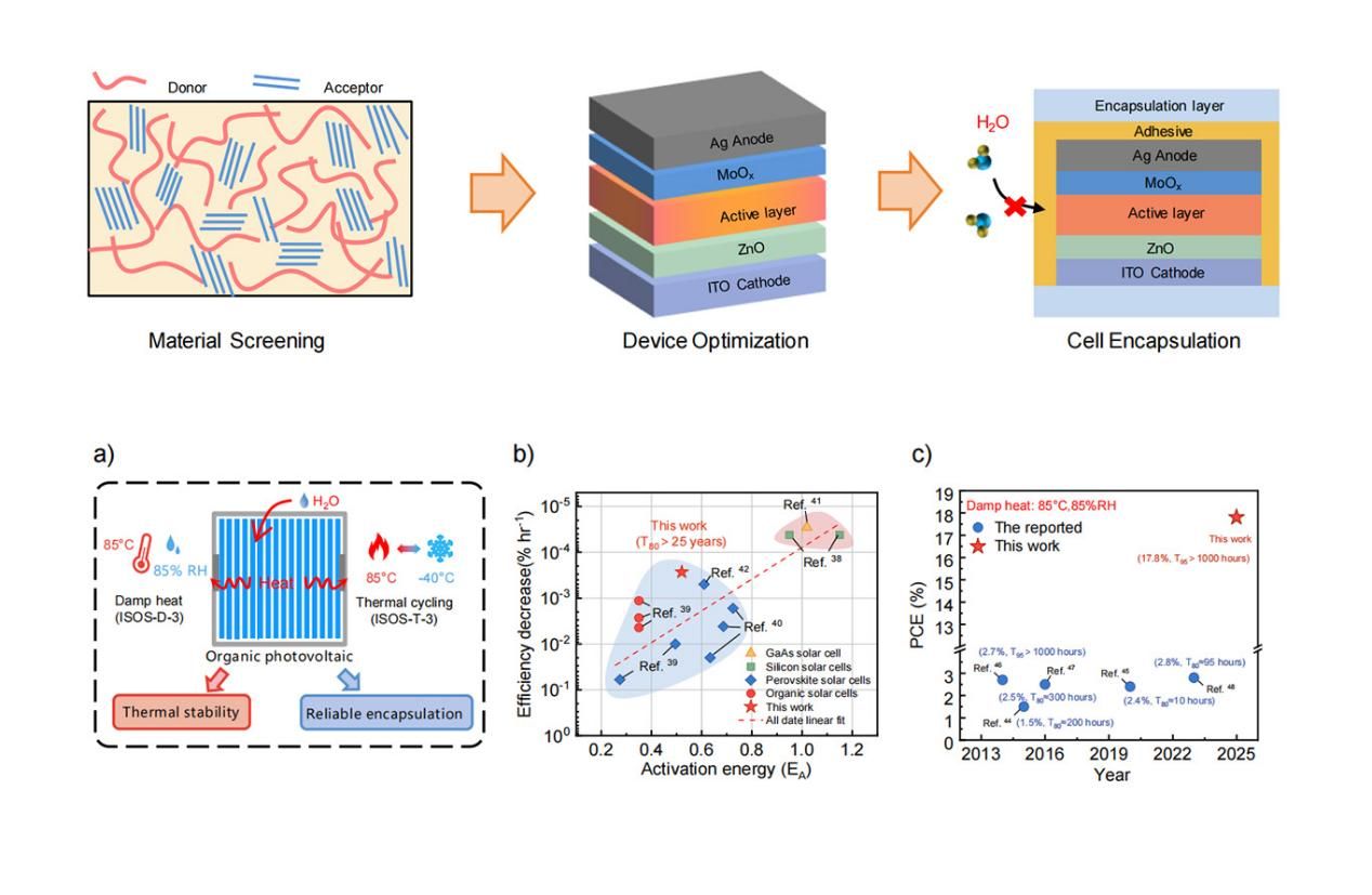 有机太阳光伏电池(OPV)因其质轻、柔性、可溶液加工等独特优势,在近太空、建筑一体化、物联网等领域展现出巨大应用潜力。然而,相较于晶硅电池,OPV器件的长期运行稳定性,尤其是在严苛环境(如高温高湿、冷热交替循环)下的可靠性,尚未得到充分验证。随着有机光伏电池效率的逐步提升,提升器件的本征与环境稳定性是亟待解决的重大问题。在前期OPV稳定性研究工作积累的基础上(Materials Advances1, 1307 (2020),Molecules28,6856 (2023),Chem. Eng. J.503,158694 (2025),ACS Appl. Mater. Interfaces17,15456 (2025) ),中国科学技术大学纳米技术与纳米仿生学院(苏州纳米所)印刷薄膜光伏实验室针对有机光伏电池湿热和冷热循环极端环境稳定性提升需求,提出了从材料本征热稳定性筛选、器件功能界面优化、器件封装方法开发三个方面同步优化的系统解决策略,首次实现高效率有机光伏电池在85℃/85%RH湿热条件以及-40℃至85℃的热循环条件下的优异稳定性结果(图1),证实了高效有机光伏电池的湿热及冷热循环可靠性。