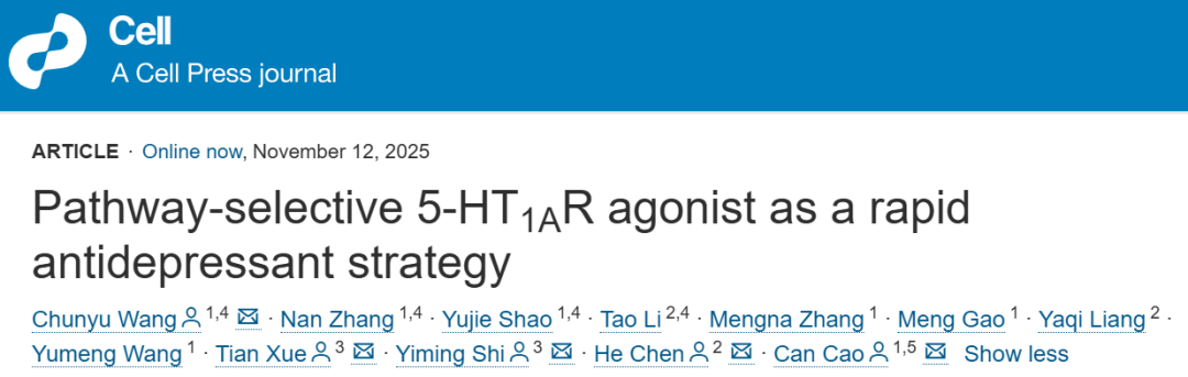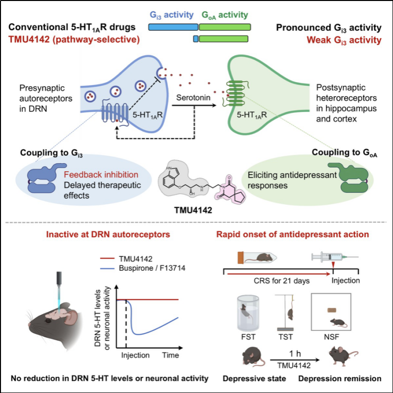 11月12日,中国科学技术大学生命科学与医学部、免疫应答与免疫治疗全国重点实验室、合肥综合性国家科学中心大健康研究院曹灿教授课题组与中国科学技术大学生命科学与医学部薛天教授课题组以及天津医科大学陈贺特聘研究员课题组联合研究团队,在Cell杂志发表题为“Pathway-Selective 5-HT1AR Agonist as a Rapid Antidepressant Strategy”的研究文章。该研究提出了一种基于5‑HT1A受体信号通路选择性的快速抗抑郁新策略,并据此理性设计出候选化合物TMU4142。实验结果显示,TMU4142在抑郁小鼠模型中展现出显著的快速抗抑郁样效果。该策略直击临床上选择性血清素再摄取抑制剂(SSRIs)类抗抑郁药物普遍存在的起效缓慢难题,为新一代快速抗抑郁药物的研发提供了崭新的思路和可行路径。