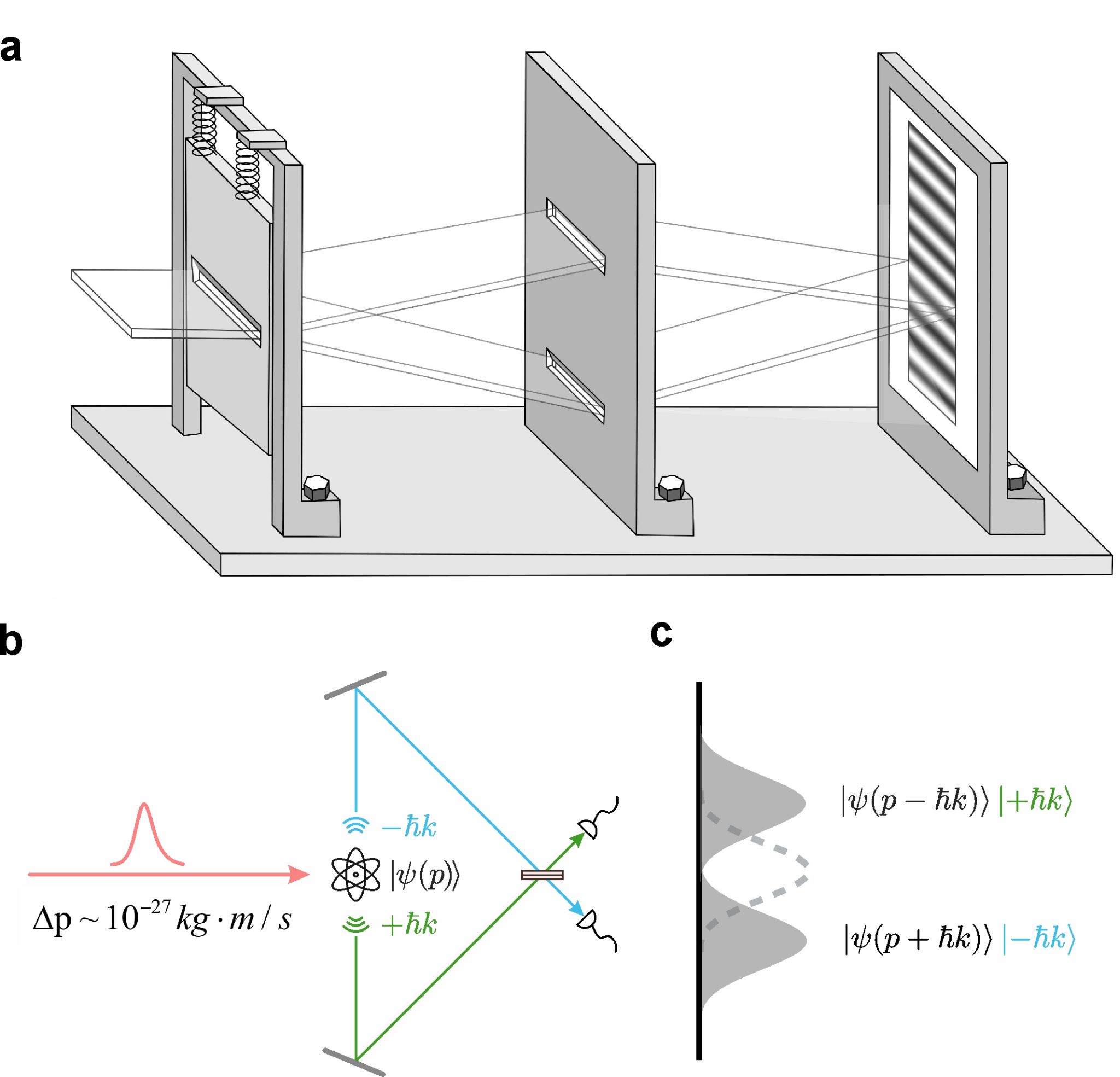 实现这一思想实验的关键在于测量有效的反冲信号,这就要求狭缝的动量不确定度要小于光子的冲击动量。然而,由于单光子的动量反冲非常微弱(~10-27kg⋅m/s),远小于宏观物体的动量不确定度。所以,爱因斯坦的这一巧妙的思想实验在过去近百年仍停留在“思想”层面。