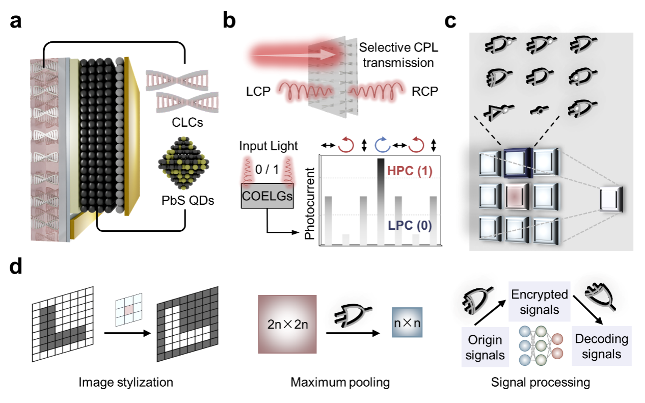 研究团队提出一种基于手性选择性的光电转换策略,通过集成具有宽光谱响应的PbS光电二极管与具有手性选择性的液晶软螺旋结构,构建了高性能圆偏振光电逻辑门。该器件展现出高达1.86的光电流不对称因子,并实现了从400到1600nm可调的宽波长响应。通过调控光电流阈值、并联光电二极管或改变输入配置,成功演示了9种逻辑门,并进一步将其应用于图像处理单元的构建。该设计不仅可在单器件上灵活切换逻辑功能,而且在模拟二值神经网络中的最大池化操作、信息加密等任务中展现出巨大潜力。相关工作实现了偏振光学与光电子学的融合,拓展了圆偏振光与逻辑运算的应用场景。