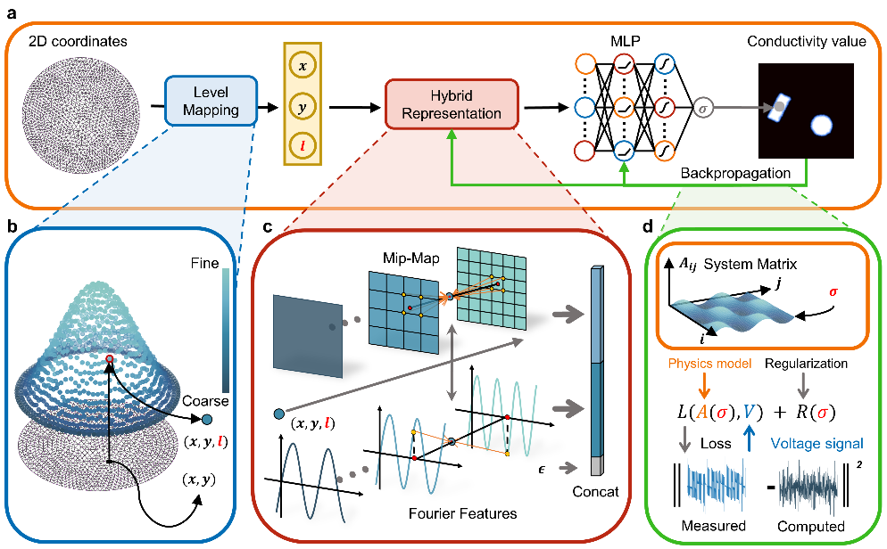针对这一挑战,研究团队深入剖析电阻抗成像的物理机理,提出了物理驱动神经补偿的自监督学习框架,并创新构建了灵敏度感知机制——通过基于物理先验的层级映射,使神经网络能够感知物理场中灵敏度的空间分布。该机制类似人眼的“注视”功能——在低灵敏度区域自动投入更多的表征能力进行补偿,而在高灵敏度区域施加适当约束,以有效抑制噪声。同时,研究团队提出了融合多尺度嵌入与傅里叶特征投影的混合表征方法,并配合自主设计的频率正则化策略,显著提升了神经网络在高、低灵敏度区域的重建能力与鲁棒性。