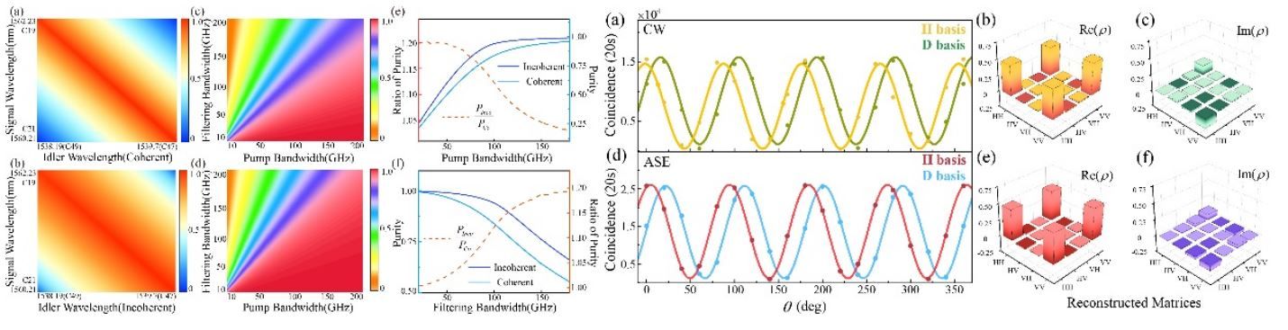 在本工作中,课题组创新性地提出并验证了使用宽带的放大自发辐射光源(ASE)作为泵浦源的量子光源制备方案,在硅波导内通过自发四波混频过程实现了高品质量子光源的制备。理论分析和数值模拟均表明,泵浦光的时域非相干性不仅不会降低量子态的质量,反而带来了诸多好处:首先,非相干光可以被视为大量独立单色光源的相位无关线性组合,这种特性打破了非线性相互作用的简并性,导致光子对产生速率的提升;其次,非相干光天然的频谱非关联特性可以被“传递”给生成的光子对,提高了量子态的频谱纯度。